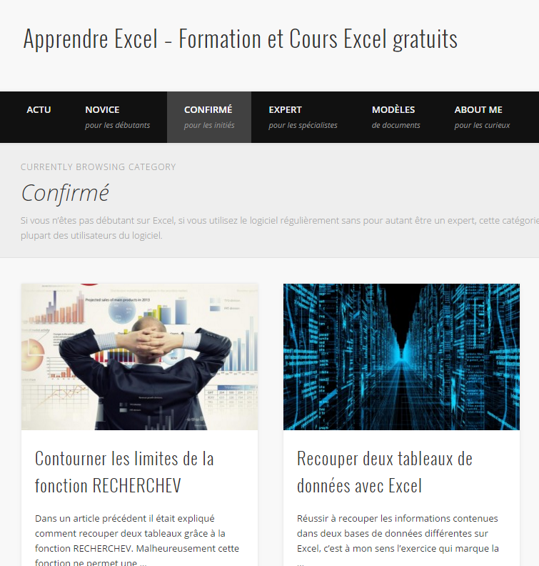 Un blog entièrement dédié à Excel et ses astuces. On y retrouve de nombreux articles complets sur des aspects variés de l’outil. Vous pourrez par exemple apprendre à faire des tableaux croisés dynamiques, apprendre à trouver des cellules vides, ou créer des menus déroulants à plusieurs niveaux. On regrette juste l’ergonomie peu pratique du site et l’organisation peu claire du contenu.