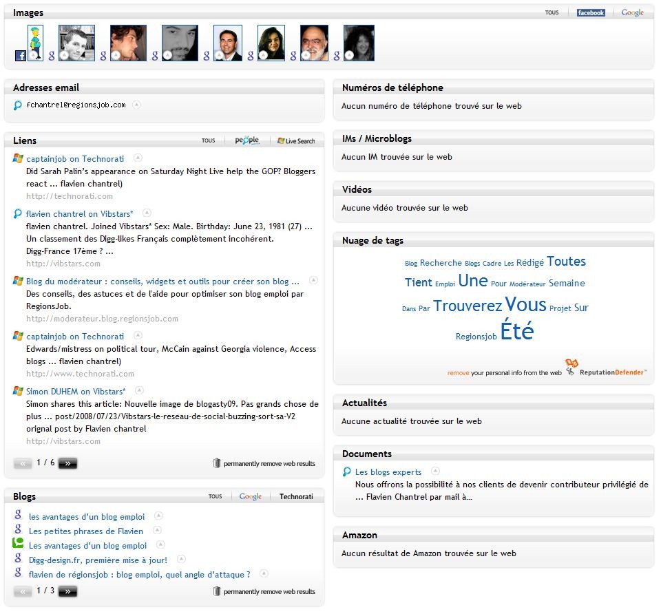 Ok, c est flippant leur truc.. moi je me bats avec Antoine Dupin de l’UDF c est pas facile 🙂 Mais je me demande ce que cela va donner lorsqu’ils iront chercher sur plus de plateformes car là avec deux trois plateformes ce qu’ils te sortent, c est assez dingue… imagine avec une vingtaine de truc, ils pourront même sortir les commentaires pourris que t a fait sous le coup de la fatigue sur un blog lié à l’emploi par exemple (no comment 🙂 )