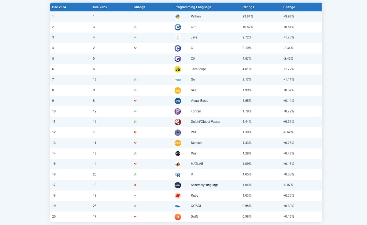 Mais Python n’est pas le seul langage à afficher une nette progression au cours de l’année écoulée. C’est aussi le cas de Go, qui progresse de 1,14 % en 2024 et occupe la 7e position, ou de Fortran, désormais 10e, qui gagne 2 places. Ces deux langages s’ancrent durablement dans la première partie de tableau. Plus bas dans le classement, Rust, à la 14e position, et Delphi/Object Pascal, à la 11e, affichent aussi une belle progression. Ils augmentent respectivement leur score de 0,48 % (+4 places) et de 0,52 % (+5 places).