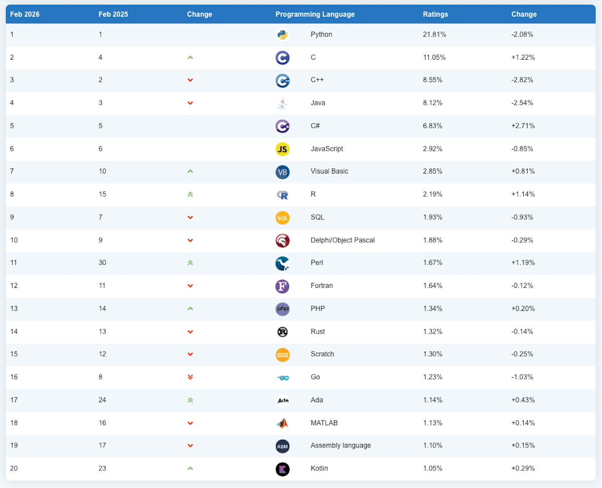 En février 2026, Python conserve largement la première place du classement TIOBE avec 21,81 % de parts de popularité, soit plus de 10 points d’avance sur son dauphin, C. Toutefois, le langage accuse un recul notable de 2,08 % sur un an. Après avoir atteint son pic de popularité en juillet 2025 avec 26,98 % de parts, Python voit désormais plusieurs langages spécialisés grignoter progressivement sa domination.