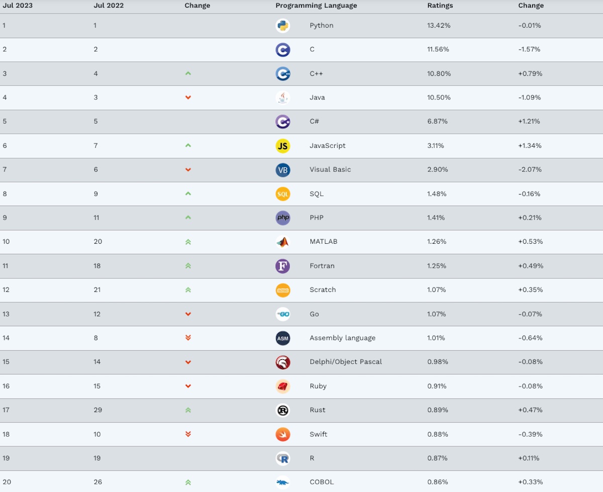 Voici le classement des 20 langages informatiques les plus populaires au mois de juillet 2023 :