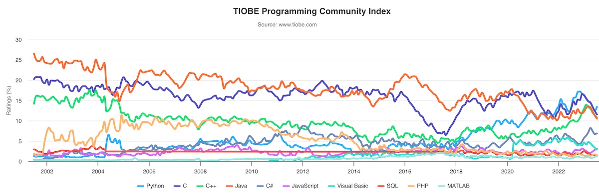 Pour rappel, l’index TIOBE n’est pas un classement des meilleurs langages de programmation, mais un indicateur de popularité actualisé mensuellement. Pour établir le classement, TIOBE attribue une note à chaque langage en s’appuyant sur les requêtes des 100 langages de programmation les plus recherchés sur les moteurs de recherches comme Google, Bing, Wikipedia YouTube ou Baidu.