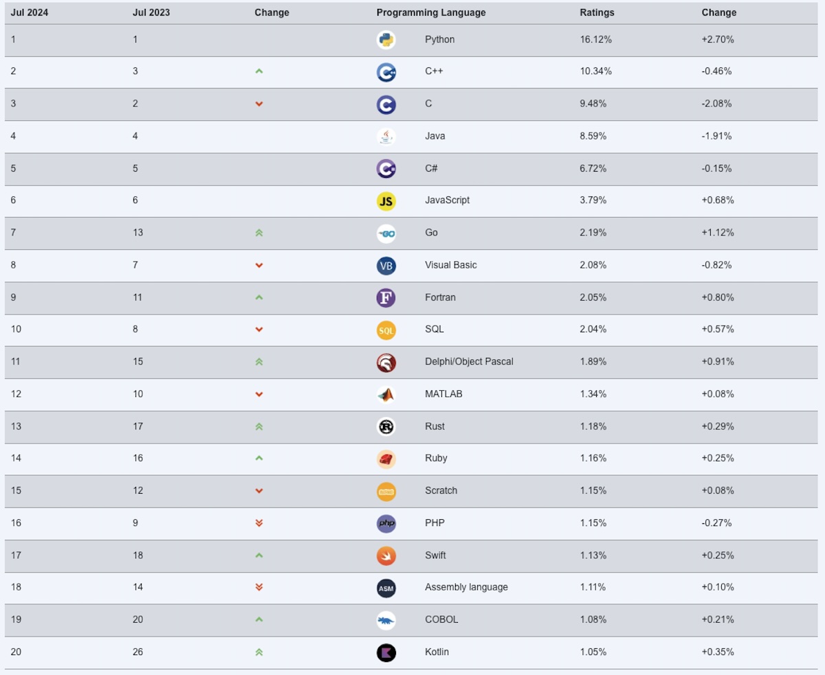 Rust n’est pas le seul langage à connaître une progression significative ce mois-ci. C’est aussi le cas de Go, classé 7e, qui s’installe durablement dans le top 10 en gagnant six positions depuis juillet 2023. Plus bas dans le classement, on observe aussi des avancées notables pour Kotlin (+6), Delphi/Object Pascal (+4) et Fortran (+2). À l’inverse, PHP, classé 16e, et Assembly language, 18e, continuent de chuter. Ces deux langages perdent respectivement sept et quatre positions en juillet 2024, et pointent désormais en queue de peloton. Pour rappel, PHP avait déjà enregistré sa plus basse position en avril dernier.