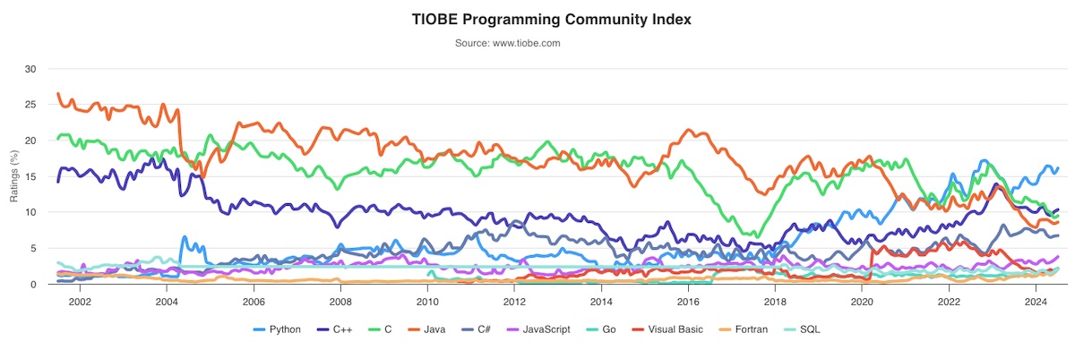En ce mois de juillet 2024, l’index TIOBE, qui évalue mensuellement le degré de popularité des langages de programmation, n’a pas connu de bouleversement. Déjà largement en tête, Python continue de creuser l’écart (+2,70 % par rapport à juillet 2023) sur ses premiers poursuivants C++ (-0,46 %) et C (-2,08 %). Java et C# complètent le top 5.