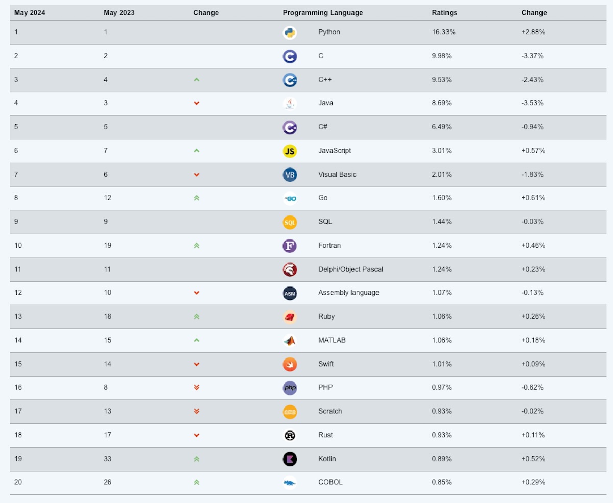Dans le reste du classement, d’autres changements sont à noter. L’évolution la plus marquée concerne Kotlin, justement, qui passe de la 33e à la 19e place, affichant une progression de 0,52 % par rapport à mai 2023. Le langage COBOL conçu, à l’instar de Fortran, à la fin des années 1950, intègre quant à lui le top 20, progressant de six places depuis mai 2023. En outre, le langage PHP, qui a déjà atteint sa position la plus basse en avril 2024, reste sur une dynamique négative. Il pointe en 16e position de l’index TIOBE. On note également une belle progression de Go (+0,61 %) et de Ruby (+0,26 %).