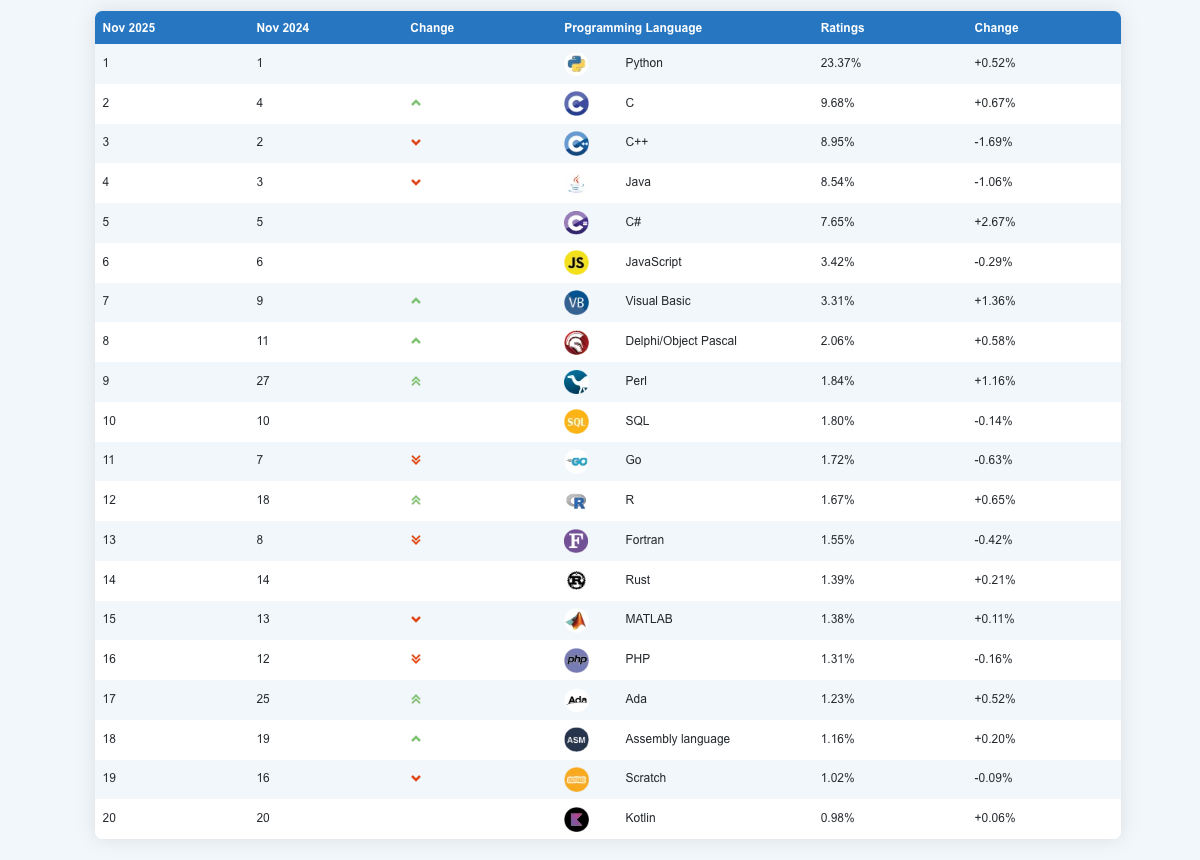 Voici le top 20 des langages de programmation les plus populaires auprès des développeurs en novembre 2025 :