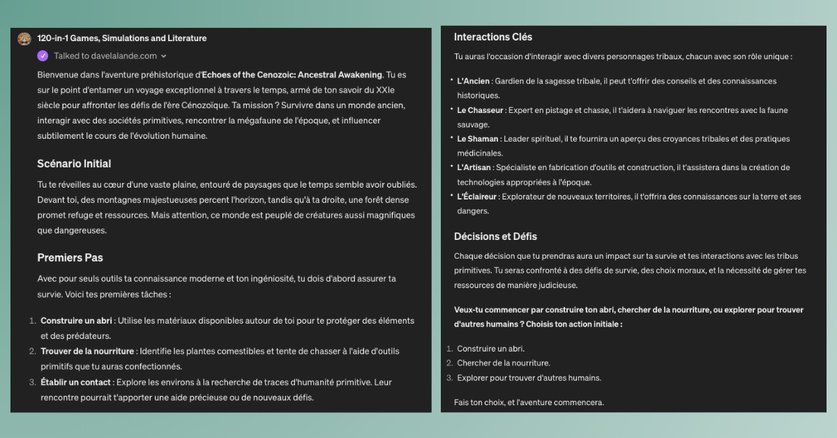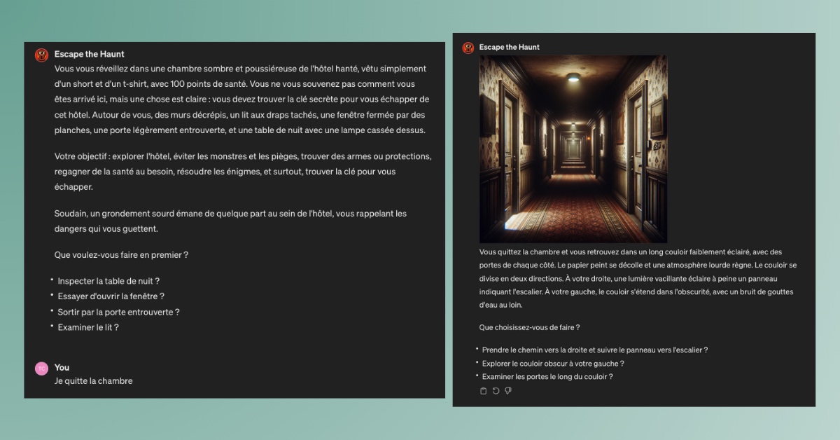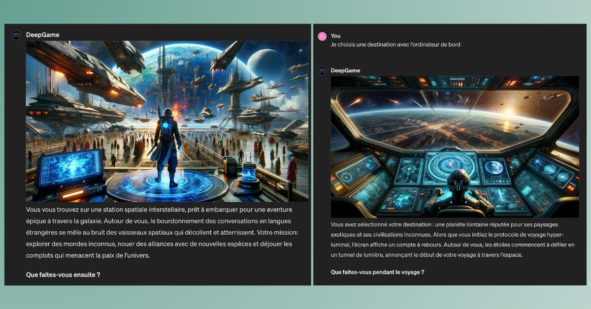 Parmi les GPTs personnalisés, on trouve de nombreux jeux dont vous êtes le héros. À mi-chemin entre le jeu de rôle et les livres-jeux, DeepGame vous met au cœur d’une aventure contée par un narrateur, le chatbot, et illustrée par DALL-E, le générateur d’images. Basé sur le principe du « what do you do next ? », ou « que faites-vous ensuite ? », ce jeu vous laisse une grande liberté dans la manière dont vous avancez dans l’histoire.