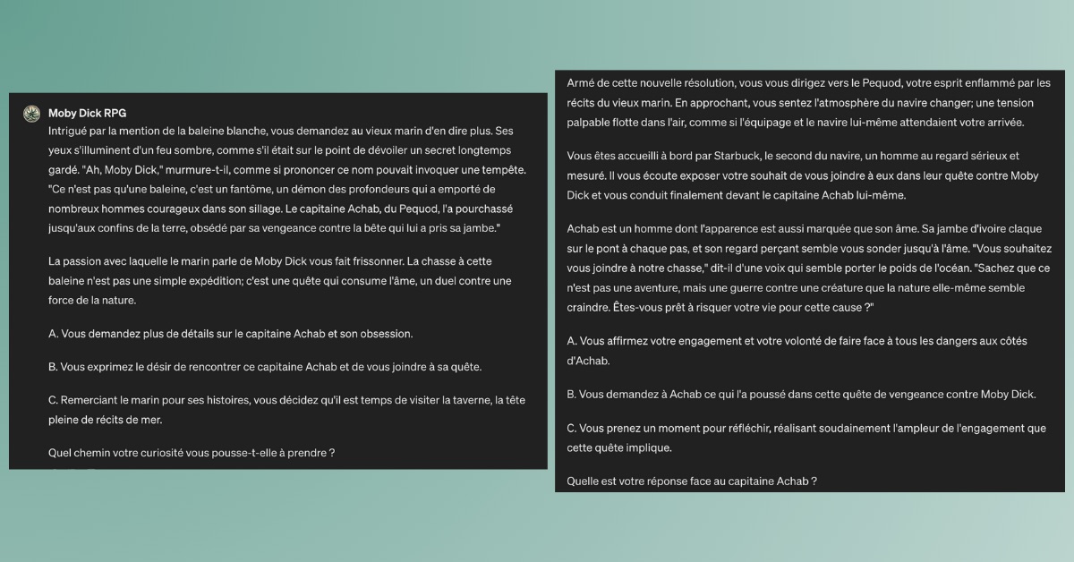 Dans ce jeu textuel, vous incarnez Ismaël, le narrateur du célèbre roman de Herman Melville, Moby-Dick. L’aventure de Moby Dick RPG débute à New Bedford, dans le Massachusetts, alors que vous déambulez sur les quais animés. Vous décrivant la scène dans laquelle vous évoluez, le chatbot vous propose plusieurs actions pour vous faire évoluer et progresser dans l’histoire. Vous engagerez des dialogues avec les différents personnages du roman, et partirez sur le Pequod à la chasse au cachalot blanc mythique en compagnie du monomaniaque capitaine Achab.