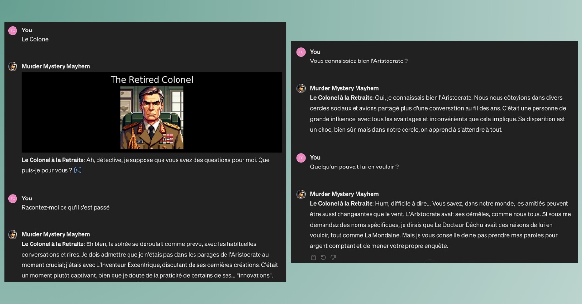 En vous plongeant dans l’ambiance grâce aux images de DALL-E, Murder Mystery Mayhem dévoile un superbe potentiel en étant très complet, jusqu’à certains scénarios vous permettant d’examiner les victimes pour vous donner de nouveaux indices dans votre enquête. Le jeu est disponible en français, il vous suffit de le préciser au chatbot en début de partie.