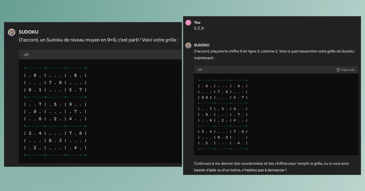 Il vous suffit ensuite de transmettre vos réponses au chatbot en lui désignant la ligne, la colonne et le chiffre à inscrire, par exemple : « ligne 2, colonne 3, chiffre 5 », ou « 1, 3, 5 ». Le GPT complètera la grille au fur et à mesure pour vous. Petit plus : des conseils et tactiques peuvent être demandés au chatbot pour vous transmettre les bons réflexes.