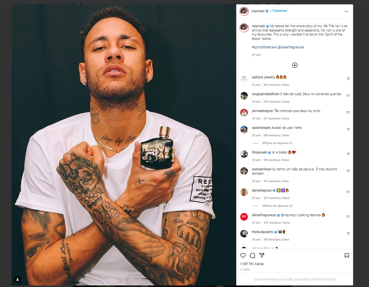 Le cas de Neymar fonctionne car Diesel a su choisir le bon profil. De plus, le joueur de football ne fait pas d’autres promotions de produits de beauté sur son compte Instagram, ce qui rend cette collaboration encore plus authentique.