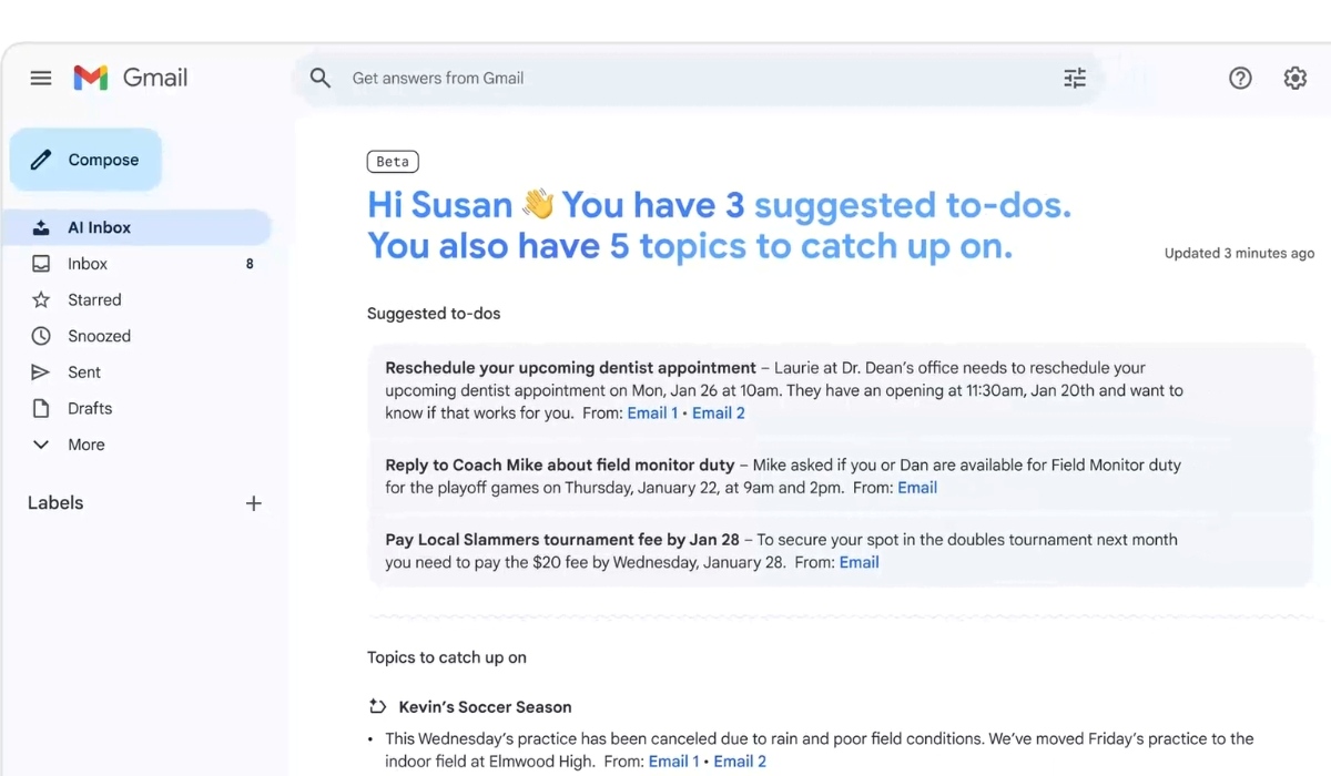 Avec AI Inbox, Gmail cherche à répondre à la surcharge de messages. Cette nouvelle vue met en avant les emails jugés importants, les tâches à accomplir et les échéances à venir, tout en reléguant les messages secondaires au second plan. L’IA identifie notamment les contacts clés, les rappels urgents ou les factures à régler, afin de proposer une sorte de briefing personnalisé. L’option est actuellement réservée à un groupe restreint de testeurs.