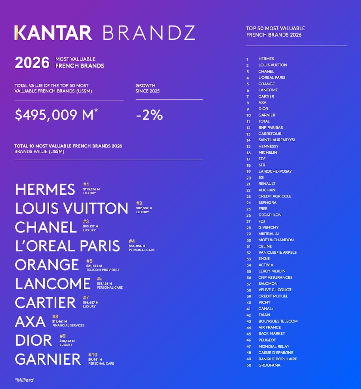 Kantar dévoile l’édition 2026 de son classement BrandZ Top 50 France, qui évalue chaque année la valeur des 50 marques françaises les plus puissantes à l’échelle mondiale, en croisant performance financière et perception des consommateurs. Cette année, la valeur cumulée du Top 50 s’établit à 495 milliards de dollars, en léger recul de 2,3 % par rapport à 2025 (506,6 milliards). Un repli que Kantar qualifie de « rééquilibrage », après plusieurs exercices de croissance soutenue (+25 % en moyenne sur les quatre dernières années).