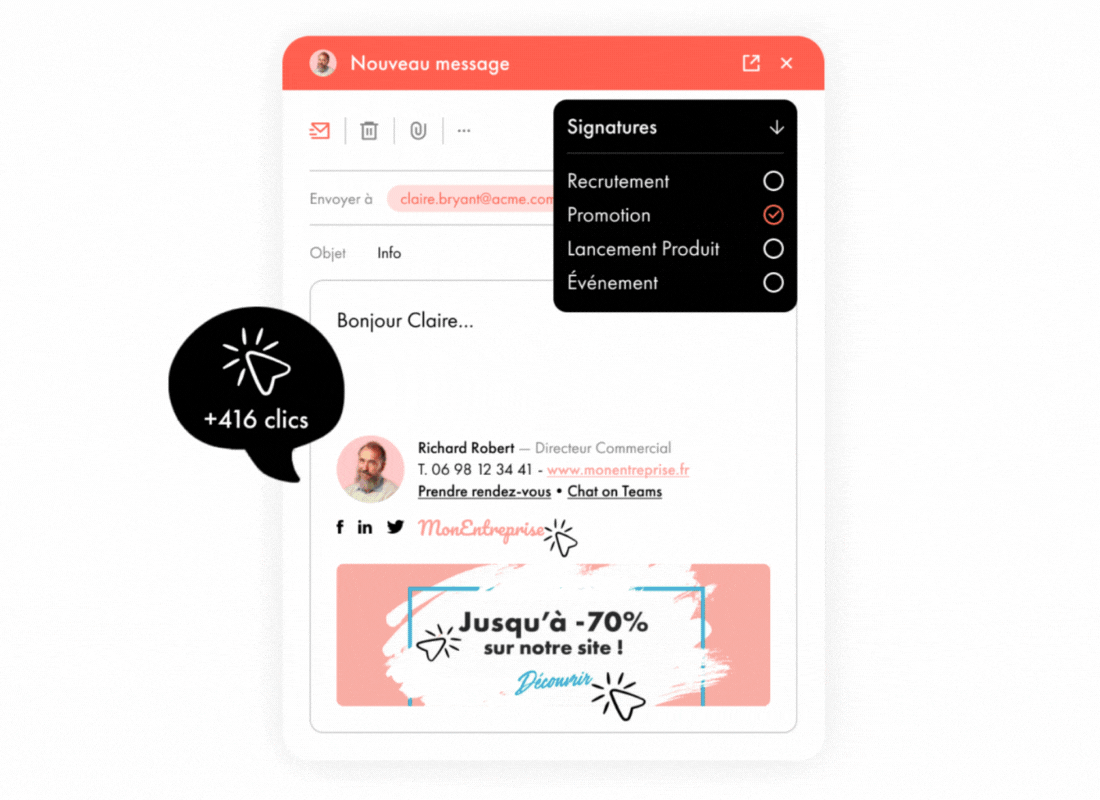 Les communications dans les signatures mail de votre entreprise sont particulièrement efficaces car elles sont associées à vos collaborateurs et non pas à votre marque en direct.