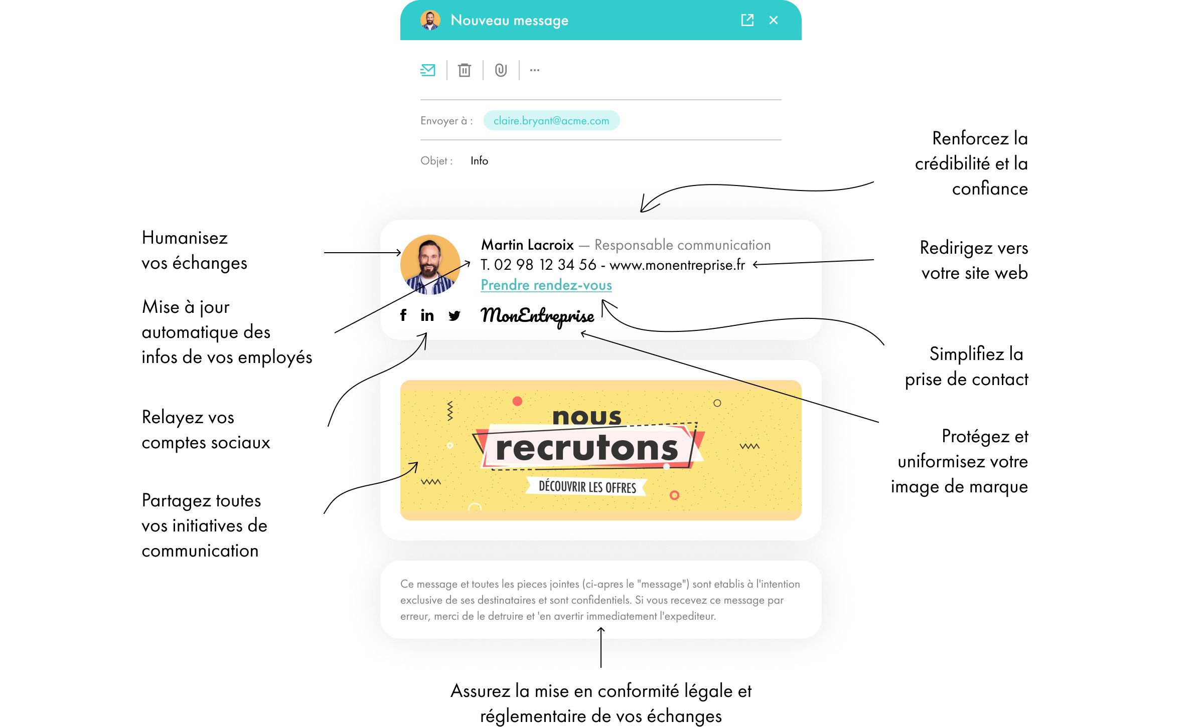 Pour de nombreuses entreprises, notamment dans certains secteurs sensibles, il est primordial de s’assurer que les emails envoyés par les collaborateurs respectent la réglementation. Letsignit permet une gestion centralisée des clauses de non-responsabilité, des divulgations, et autres mentions légales via l’intégration automatique de disclaimers.