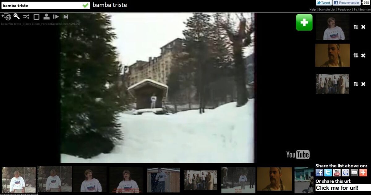 Le plus minimaliste, au premier abord ! ! ListAndPlay utilise la recherche instantanée popularisée par Google Instant, qui fait que les vidéos apparaissent au fur et à mesure que vous tapez leurs mots clés. Ensuite, les vidéos correspondantes sont visibles en bas, cliquez simplement dessus pour les afficher puis sur le gros « + » vert pour les intégrer à votre playlist. Celle-ci pourra être partagée simplement sur Facebook, Twitter etc et une url vous sera délivrée, correspondant à la playlist que vous venez de créer.