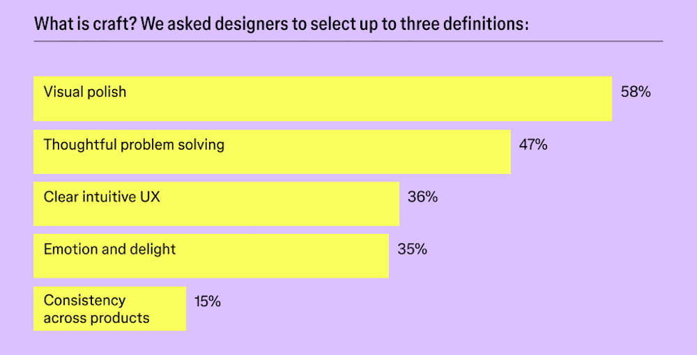 Au-delà des outils, la notion de craft (le soin et l’attention portés au processus créatif) reste centrale dans l’expérience des designers. Sa définition varie selon les profils : 58 % l’associent au polish visuel et à l’attention aux détails, 47 % à la résolution de problèmes et à la pensée systémique, 36 % à la clarté de l’expérience utilisateur.