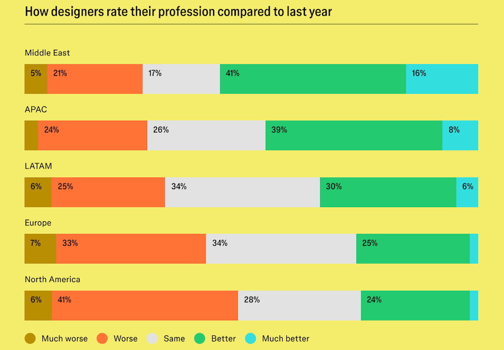 Les designers se montrent partagés sur l’état de leur profession. 36 % estiment qu’elle s’est améliorée au cours de l’année, 35 % qu’elle s’est dégradée et 29 % qu’elle est restée stable. Cette division reflète des réalités géographiques contrastées. Le Moyen-Orient, porté par l’essor de son économie numérique, affiche l’optimisme le plus marqué, avec une satisfaction qui y atteint 63 %, contre 38 % seulement en Amérique du Nord et en Europe. Ces deux dernières régions subissent de plein fouet les vagues de licenciements médiatisées dans la tech, avec respectivement 63 % et 59 % des répondants estimant que le marché de l’emploi s’est détérioré.