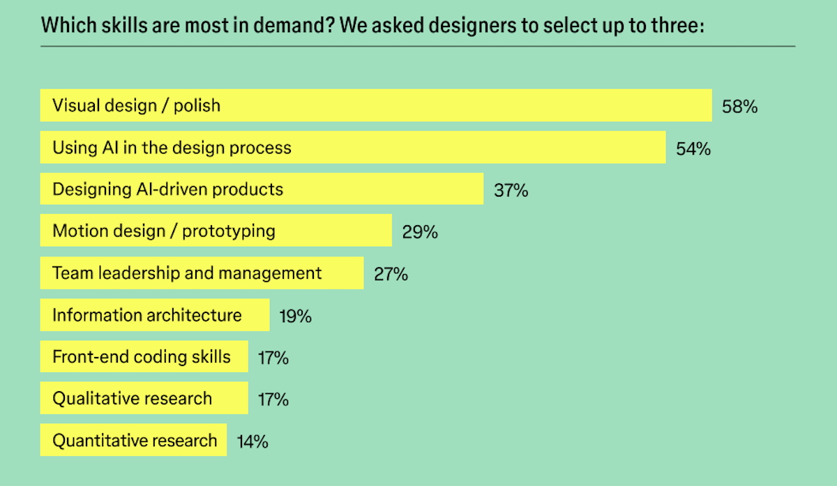 Cette adoption s’accompagne d’une évolution des compétences recherchées. L’utilisation de l’IA dans le processus de design arrive en deuxième position des skills les plus demandés (54 %), juste derrière le visual design (58 %). La conception de produits intégrant l’IA complète le podium (37 %), devançant des compétences traditionnelles comme le motion design (29 %).