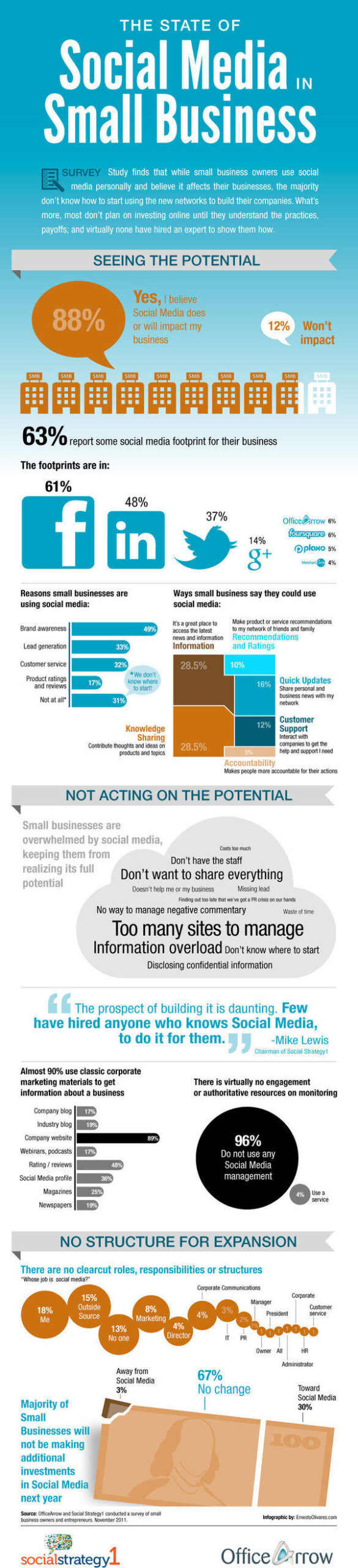 Le premier chiffre qui saute aux yeux est la prise de conscience de l’intérêt des médias sociaux dans le processus d’achat. Ainsi, 88% pensent que les médias sociaux ont ou vont impacter leur business. 63% y ont d’ailleurs déjà une présence. 61% sur Facebook, 48% sur LinkedIn, 37% sur Twitter et 14% sur Google plus. La majorité (49%) y sont pour développer leur notoriété. La principale difficulté ? Il y a trop d’espaces sur lesquels être ! Même si notre enquête sur les community managers indiquait que les PME sont les plus gros pourvoyeurs de postes, les TPE ne semblent pas concernées, puisque 96% d’entre elles n’ont pas de community manager attitré. Et 30% seulement des TPE veulent s’engager plus sur les médias sociaux l’année prochaine. Ces chiffres et beaucoup d’autres sont à retrouver sur cette infographie.