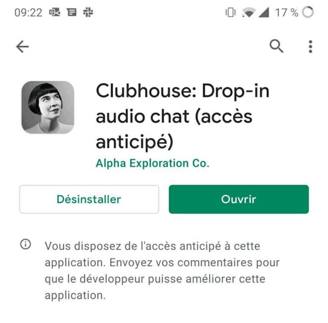 Vous ne verrez peut-être qu’un bouton pour vous préinscrire ; dans ce cas, Google indique que l’application sera téléchargée dès que possible. Mais une fois préinscrit, revenez sur la fiche Google Play de Clubhouse : vous devriez alors pouvoir télécharger l’application directement.