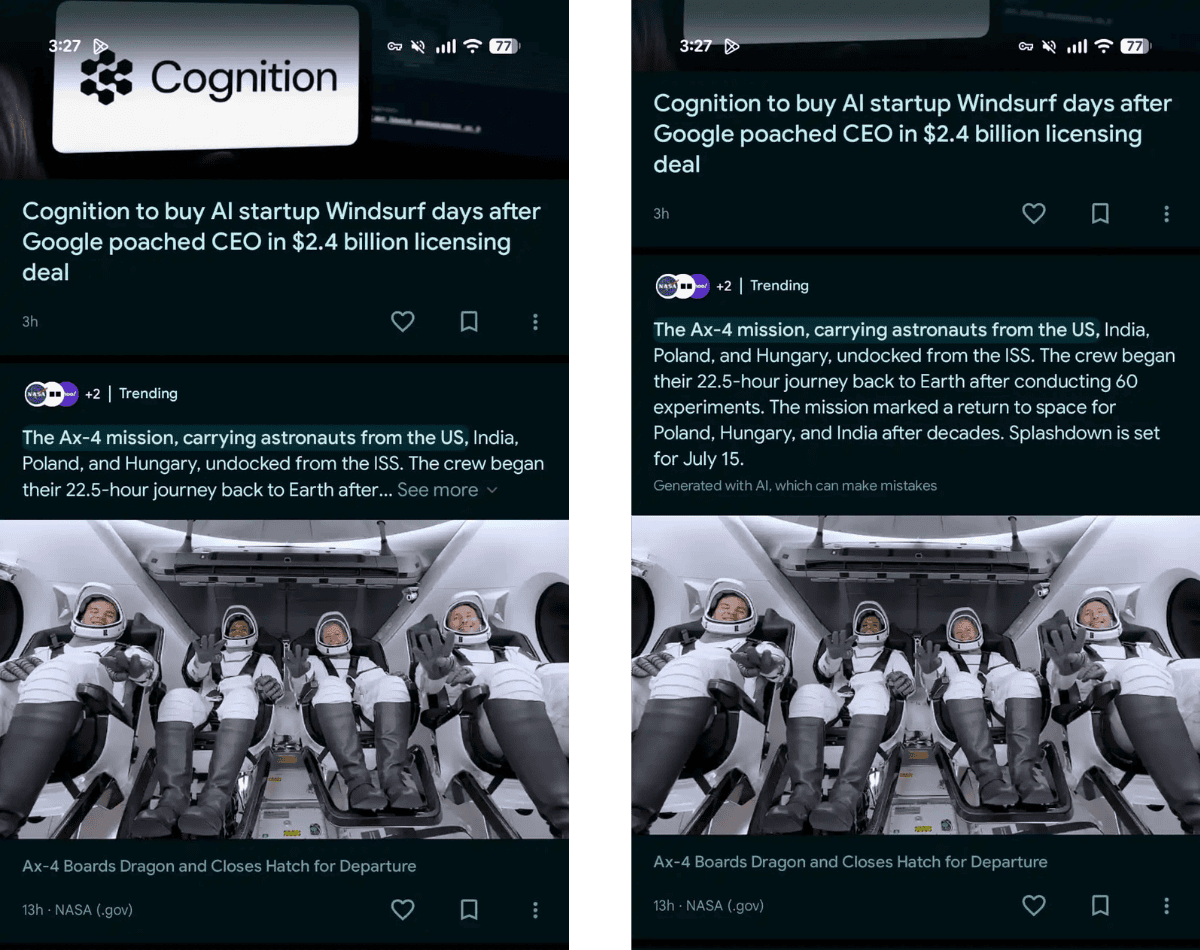 Repérés par le média 9to5Google sur Android et sur iPhone, puis confirmés par Google sur TechCrunch, les résumés générés par IA sur Discover sont en cours de déploiement aux États-Unis. Après avoir identifié un sujet tendance, traité par plusieurs médias, Google utilise Gemini pour générer un résumé des éléments clés du contenu. Les logos des trois sources principales sont affichés en haut du résumé, l’article cité est ensuite proposé. À noter que des résumés par IA de vidéos YouTube ont aussi été repérés sur Discover. Une nouvelle manière de réduire encore plus le trafic des médias…