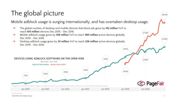 Il y a 2 ans, l’adblocking sur mobile était minoritaire par rapport au l’adblocking sur desktop. Depuis, les courbes se sont inversées : on estime qu’en décembre 2016, 380 millions de mobiles bloquaient les publicités contre 236 millions d’ordinateurs.