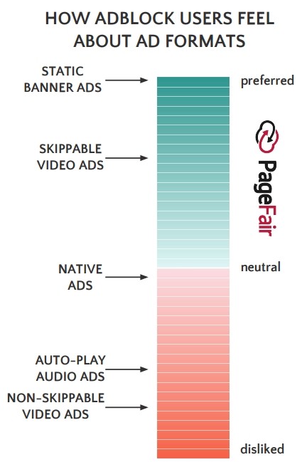 Nous le disions plus haut, « 77% des utilisateurs accepteraient de visualiser certains types de publicités ». Les usagers citent notamment les bannières statiques et les publicités vidéo qu’on peut passer (skip). Ils sont relativement neutres vis-à-vis du native advertising, mais ne tolèrent pas les publicités audio en auto-play et les publicités vidéo qu’ils sont obligés de regarder jusqu’au bout.