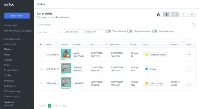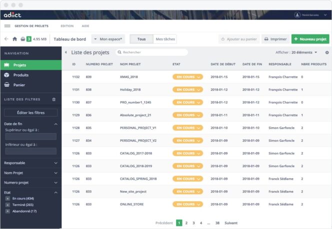 La solution Adiict Gestion de Projet permet l’utilisateur de gérer toutes ses activités créatives sur la plateforme Adiict. « C’est un dashboard qui donne accès à l’ensemble de ses projets en temps réel pour suivre l’avancement de ses publications à travers les différentes étapes du workflow : la création du chemin de fer, le statut de maquette et la vérification des fichiers, avant qu’ils soient prêts à être imprimés. Il permet vraiment de piloter le plan d’action commercial d’une société. »