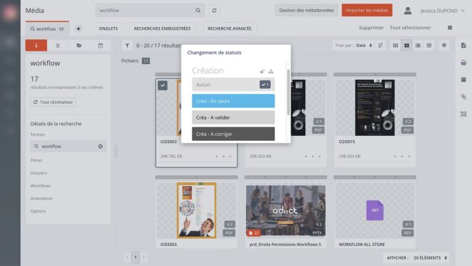 Véritable outil de production collaboratif, le workflow collaboratif permet de faciliter les échanges et les circuits de validation entre les équipes, qu’elles soient internes ou externes, avec un client ou un fournisseur. Les différentes étapes du workflow sont personnalisables en y ajoutant un statut et des tâches attribuées en fonction des utilisateurs. « Il permet de valider, corriger et annoter l’ensemble du processus pour suivre la fabrication des fichiers gérés dans le DAM. Tous les échanges sont automatisés selon le process défini en amont, permettant ainsi aux équipes de gagner un temps précieux qu’elles peuvent consacrer à des tâches à plus forte valeur ajoutée », poursuit Sébastien Jeuniau.
