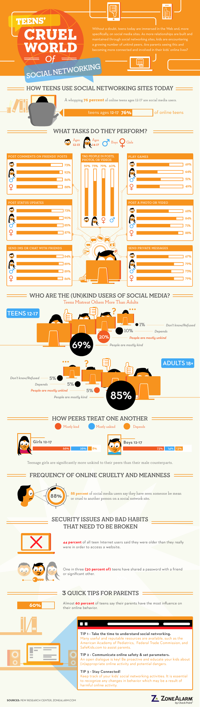 Leurs activités sont sont détaillées : commenter l’actualité de leurs amis, mettre à jour leur statut, et utiliser la messagerie instantanée sont les occupations les plus partagées. Contrairement à ce que l’on pourrait penser, les jeux comptent parmi les activités les moins populaires sur les réseaux sociaux, leur usage étant minoritaire. Les réseaxu sociaux sont donc davantage utilisés pour leur objectif premier, c’est-à-dire garder le contact et discuter entre amis. L’infographie étudie également la question de la méchanceté sur les médias sociaux… Certaines affaires de harcèlement entre adolescents ayant défrayé la chronique ces derniers temps. Sont-ils plus cruels en ligne que les adultes ? Apparemment, oui. Parmi les 12-17 ans, si la majorité des ado se définissent comme généralement gentils, 20% estiment être méchants la plupart du temps sur les réseaux sociaux, contre seulement 5% des adultes. On ne sait pas trop ce que recouvre cette méchanceté, mais on peut penser qu’il s’agit de moqueries, de paroles un peu rudes… sans forcément aller jusqu’au harcèlement répété envers une seule et même personne. Heureusement, 60% des adolescents affirment que leurs parents ont une influence sur leur comportement en ligne : il est donc possible de rectifier le tir… Et inculquer quelques règles élémentaires de sécurité, un tiers des ado ayant déjà communiqué leur mot de passe à un ami. Pas très recommandé !