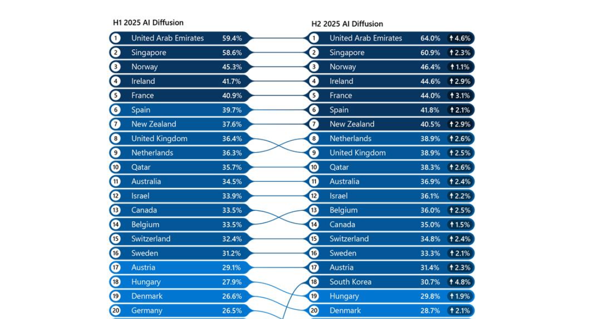 Les pays ayant investi tôt dans les infrastructures numériques, la formation à l’IA et l’adoption gouvernementale (…) continuent de mener la course, analyse Microsoft.