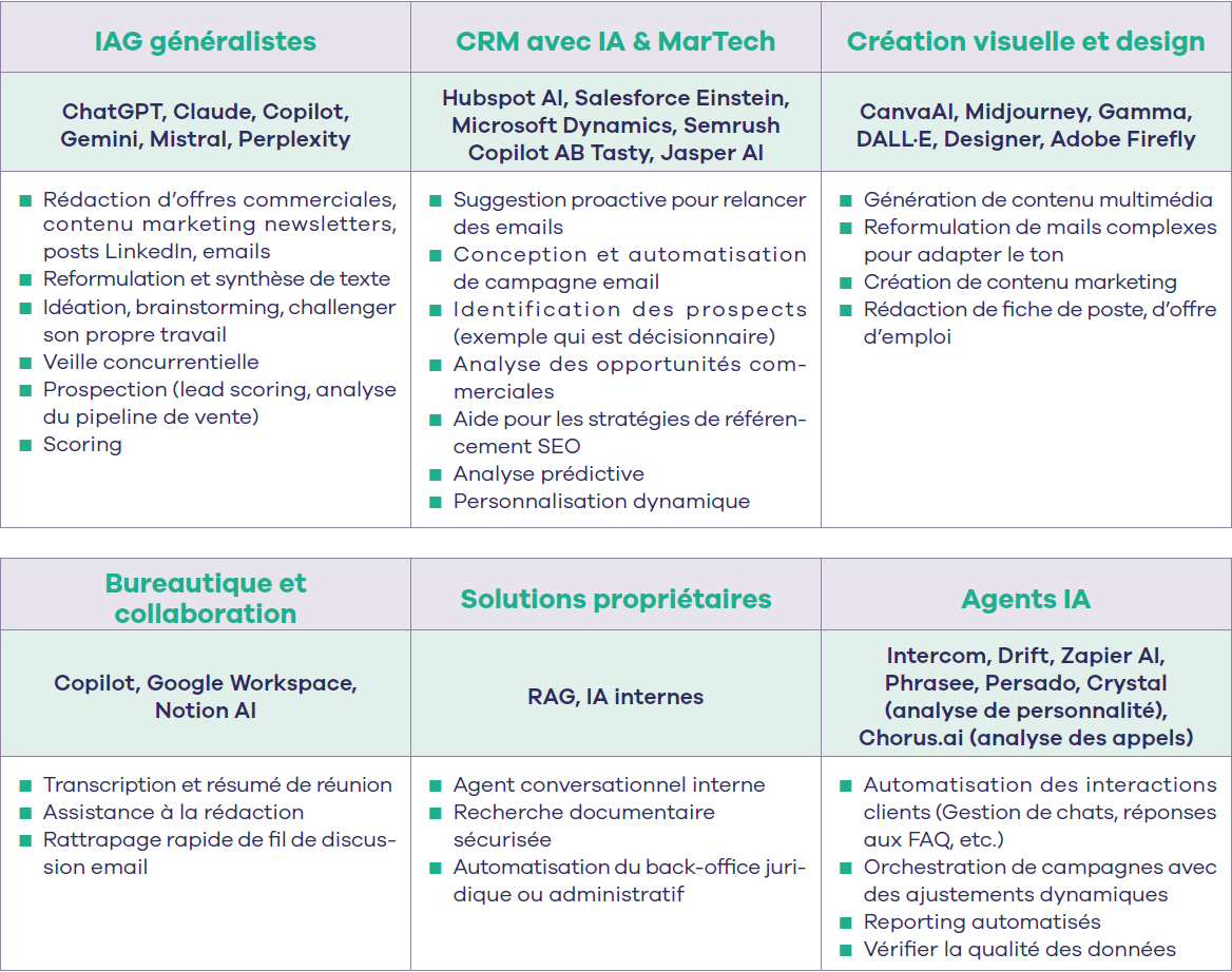 Les professionnels du commercial-marketing n’utilisent pas une seule IA, mais un écosystème d’outils aux usages bien distincts. Pour rédiger, reformuler ou faire de la veille, les grands modèles de langage comme ChatGPT, Claude, Copilot ou Gemini, sont devenus des réflexes quotidiens. La prospection et le scoring de leads passent de plus en plus par des CRM boostés par l’IA, tels que HubSpot AI ou Salesforce Einstein, tandis que la production de contenu visuel se réinvente avec Canva AI ou Adobe Firefly. Les agents conversationnels, eux, prennent en charge une partie croissante des interactions clients.