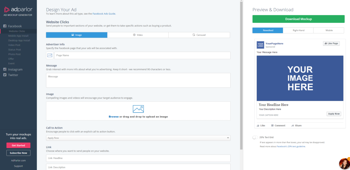 AdParlor : créer des aperçus des différents formats publicitaires Facebook, Instagram et Twitter