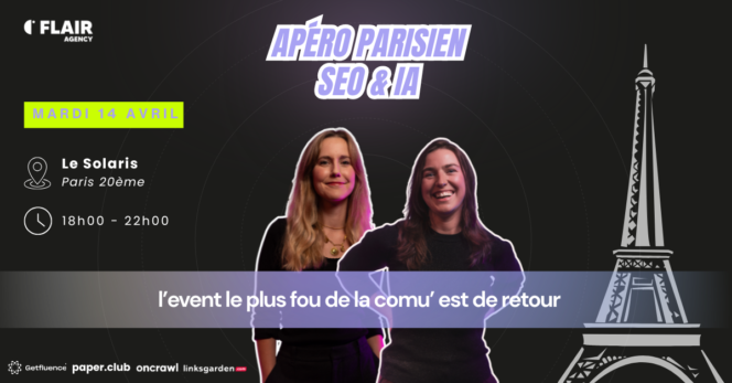 Alors que l’intelligence artificielle redessine en profondeur les pratiques SEO, les professionnels du secteur doivent se tenir informés régulièrement des dernières tendances et des enjeux dans un environnement qui évolue très vite. Partager vos expériences entre pairs et étoffer votre réseau, c’est précisément ce que propose Flair Agency, qui organise la seconde édition de son Apéro Parisien SEO et IA, qui se tiendra le 14 avril 2026 à Paris. Après une première édition réussie, cette soirée conviviale est à nouveau pensée pour les profils SEO, IA et marketing parisiens qui souhaitent repartir avec des idées concrètes activables immédiatement et des connexions utiles.