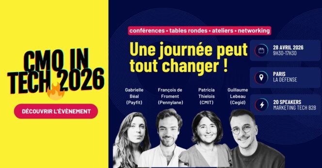 Entre l’essor de l’IA, la pression sur les budgets, la complexification des stacks Martech et la nécessité d’aligner les équipes marketing, sales et produit, les responsables marketing B2B doivent de plus en plus faire face à de multiples défis. Pour répondre à ces enjeux, le cabinet Gtec vous invite à son événement CMO in Tech, le 28 avril 2026, à Paris La Défense. Cette journée, qui est dédiée aux marketeurs de la tech B2B, réunit les directions marketing, les responsables growth, communication et produit, pour apprendre, partager et s’inspirer, dans un cadre à la fois convivial et propice au networking.