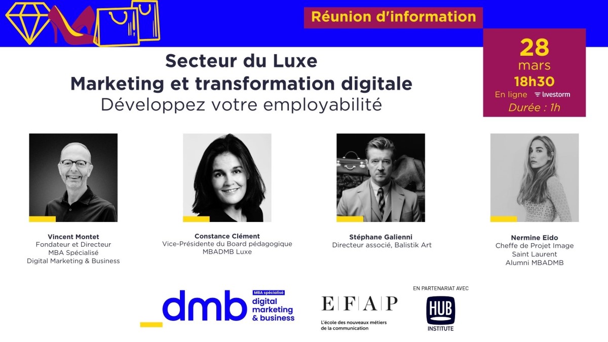 Réservez dès maintenant votre place pour la webconférence 100 % dédiée aux enjeux de la transformation digitale dans le secteur du luxe, qui se tiendra le jeudi 28 mars à 18h30 (durée : 1h). Elle sera animée par Vincent Montet, fondateur et directeur du MBADMB, et vice-président de l’ACSEL, l’association de l’économie numérique. Il sera accompagné par :