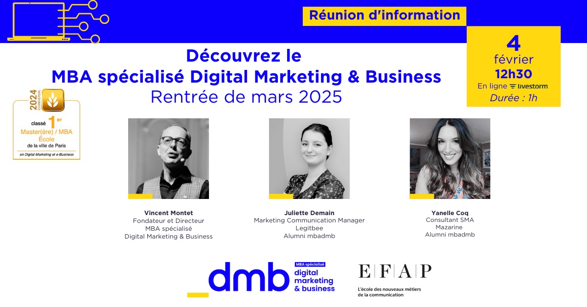 Ce programme sera complété par le témoignage d’experts du marketing digital en poste et le retour d’expérience d’alumni du MBA spécialisé Digital Marketing & Business de l’EFAP, avec un temps dédié pour poser toutes vos questions aux participants.