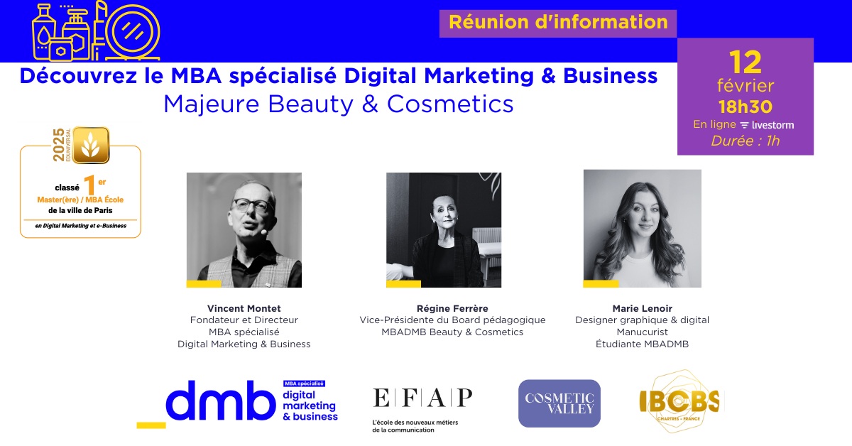 Dans ce contexte, comment se former pour acquérir les compétences attendues dans ce domaine ? Fruit d’un partenariat exclusif avec l’IBCBS (école de référence dans la beauté et la cosmétique) et la Cosmetic Valley (collectif des industriels du secteur), le MBA spécialisé Digital Marketing & Business de l’EFAP vous invite à son prochain webinar, qui se déroulera le jeudi 12 février 2026 à 18h30. L’objectif : explorer les grandes tendances de cette industrie tout en identifiant les compétences nécessaires et les opportunités à saisir en vue de réussir votre projet professionnel.