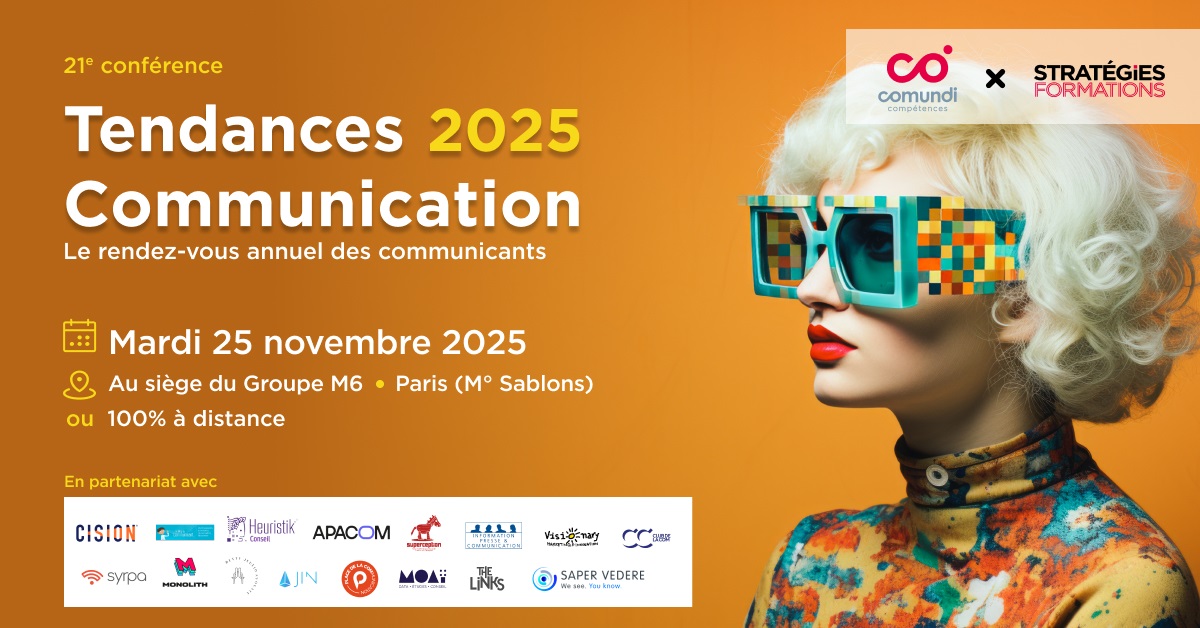 Pour assister à la conférence annuelle Tendances Communication 2025, organisée par Comundi mardi 25 novembre à partir de 9h dans les locaux de M6 à Neuilly-sur-Seine, c’est très simple : rendez-vous sur le site de l’événement en cliquant sur le bouton S’inscrire. Si vous souhaitez participer à la conférence en présentiel, l’inscription est à 1 190 € HT (déjeuner et avantages partenaires inclus). Si vous choisissez de la suivre à distance, en visioconférence, elle est à 790 € HT.