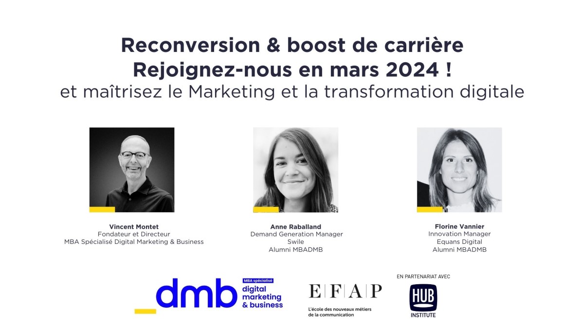 Vous êtes intéressé par les métiers du marketing et de la transformation digitale, mais vous ne souhaitez pas attendre le mois d’octobre prochain pour vous former ou vous reconvertir dans ce domaine ? La prochaine réunion d’information en ligne, organisée par l’EFAP le mardi 30 janvier à 18h30, vous apporte toutes les clés afin de vous aider à développer vos compétences, en rejoignant le MBA Spécialisé Digital Marketing & Business (MBADMB) dès le mois de mars 2024 grâce à la rentrée décalée.