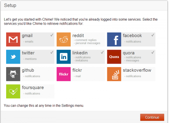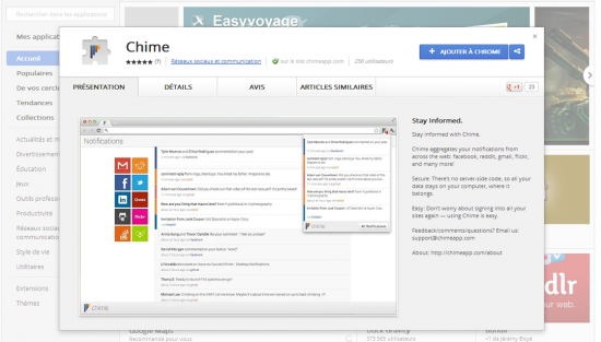 C’est une évidence, le navigateur Google a un train d’avance sur les autres, et c’est celui qui intègre le plus d’outils innovants. Chime vient confirmer cette tendance. Il s’installe en quelques secondes via le le Chrome Web Store. Une fois installé, l’application se logue toute seule à vos comptes sociaux déjà enregistrés sous Chrome. Pas besoin, d’entrer ses identifiants Gmail, Twitter, Facebook, Linkedin, Reddit, Quora, Github, Flickr, Foursquare et Stackoverflow. Tout se fait automatiquement. Pratique et redoutablement efficace !