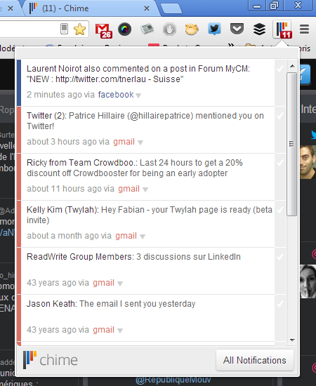 Pour voir plus en détail vos nouvelle notifications et par exemple lire un nouvel e-mail, un clic sur l’extension puis sur le notification à lire vous redirigera vers la source de la notification. A l’usage, l’outil se montre vraiment utile, rapide et intuitif. Si le rapatriement des notifications de certains services tels Foursquare, Reddit ou Quora n’a pas vraiment d’utilité, pour d’autres, c’est vraiment idéal. Notons aussi que les mentions s’affichent plus rapidement sous Chime que sous Tweetdeck ou Twitter. Idéal pour savoir en temps réel ce qu’il se passe sur le réseau. Que ce soit pour centraliser sa présence Facebook, Twitter, Linkedin ou Gmail, Chime se montre vraiment efficace… Voire indispensable.