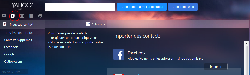 - Importez la liste de vos amis Facebook sur votre compte Yahoo (oui, il en faut un…). Pour cela, allez dans votre liste de contact puis cliquez « importer » sous l’icône correspondante.