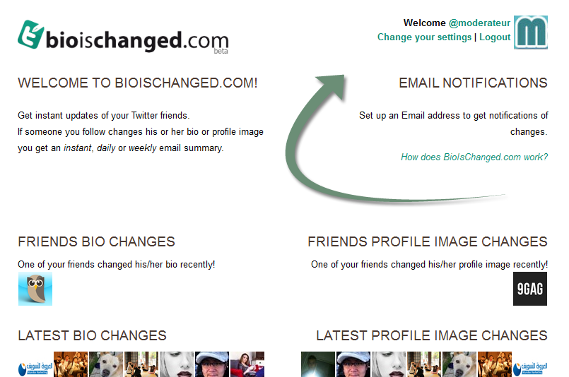 Pour ne rien rater des actualisations des bios de vos amis sur Twitter, le site Bio is changed propose un service d’alertes. Vous recevrez un mail à chaque fois qu’une bio ou qu’une photo change. Vous pouvez également suivre ces changements directement depuis le site.Parfait pour être au courant de tout !