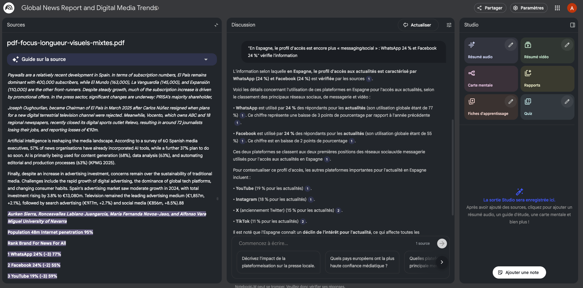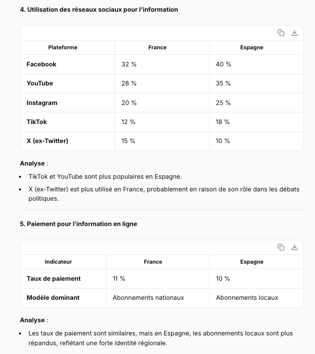 Concernant la structuration de la réponse, Perplexity livre des résultats bien formés, avec une hiérarchisation correcte des informations et un style agréable à lire : c’est clairement sa force. Le tableau comparatif France/Espagne sur le rapport Reuters est pertinent et il propose une synthèse exhaustive sur la situation mondiale, si l’on ne tient pas compte des erreurs dans les données avancées.