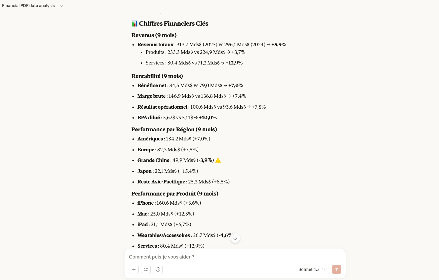 Dans l’ensemble, ChatGPT s’est montré moyennement convaincant pour analyser des PDF, la qualité de son analyse dépendant du type de données transmises. Sur le rapport financier d’Apple, qui contient uniquement des données chiffrées, il extrait efficacement les chiffres clés, les présente clairement et se permet même d’ajouter des pourcentages d’évolution, ce qui améliore la lisibilité de l’ensemble. L’interprétation du prompt reste généralement fiable, même si le modèle prend parfois quelques libertés dans les éléments mis en avant.