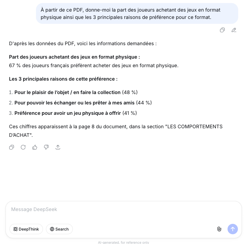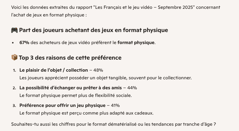 - Le rapport 2025 du SELL, sur le jeu vidéo en France, avec principalement des graphiques pour illustrer les données, accompagné du prompt suivant : « À partir de ce PDF, donne-moi la part des joueurs achetant des jeux en format physique ainsi que les trois principales raisons de préférence pour ce format. »