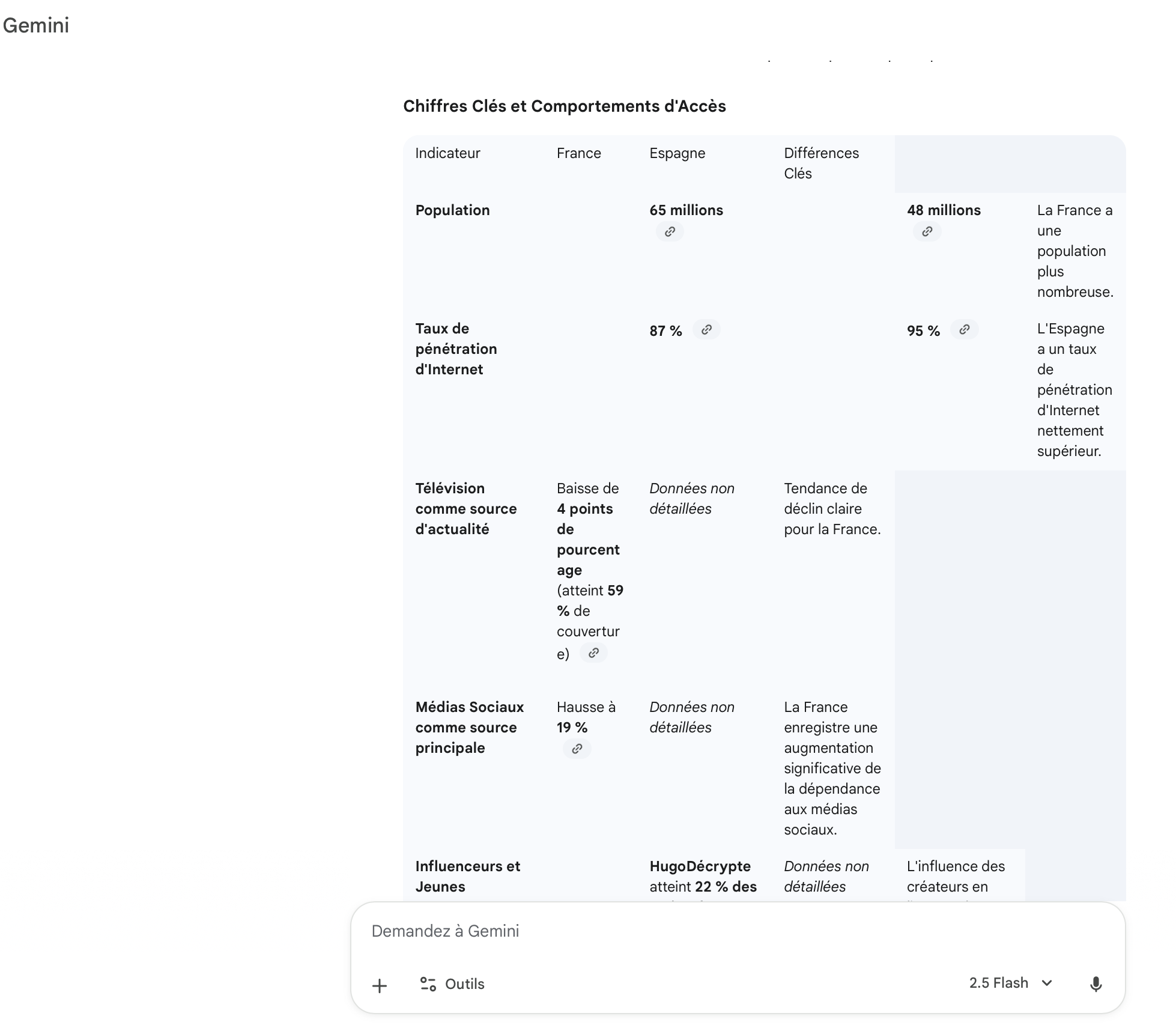 Sur le 3e exercice, Gemini propose une synthèse exhaustive et riche en chiffres, en déclinant une comparaison France/Espagne au format tableau. Dommage que celui-ci manque de lisibilité (cf. le tableau ci-dessous) et que certaines informations soient omises par excès de prudence alors qu’elles sont disponibles dans le PDF. Mais, la prudence sera toujours préférée à l’invention de chiffres fantaisistes pour donner une réponse « quoi qu’il en coûte » ! Gemini couvre aussi plus large que demandé, au risque de se disperser par moments.