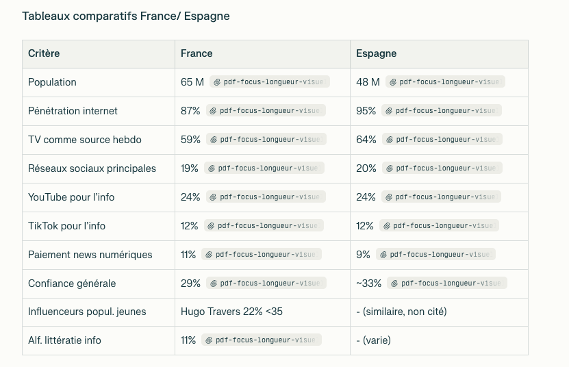 - Le Digital News Report 2025 de Reuters, sur la consommation de l’information en France, avec un document très dense (171 pages) qui mêle texte, graphiques et images, le tout en anglais, accompagné du prompt suivant : « En analysant ce PDF, fournis une synthèse exhaustive et chiffrée de la situation mondiale de l’accès à l’information. Ensuite, réalise une comparaison structurée entre la France et l’Espagne sur les comportements d’accès à l’information, avec les chiffres clés et les principales différences. »